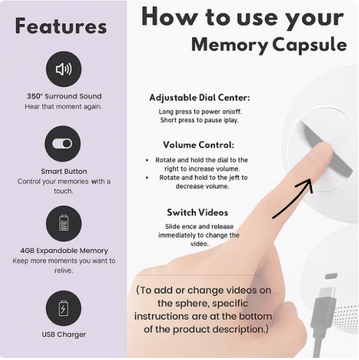 Memory Orb is a 3D crystal ball with a built-in screen that plays your personalized video. Simply connect it via USB-C and upload your file.